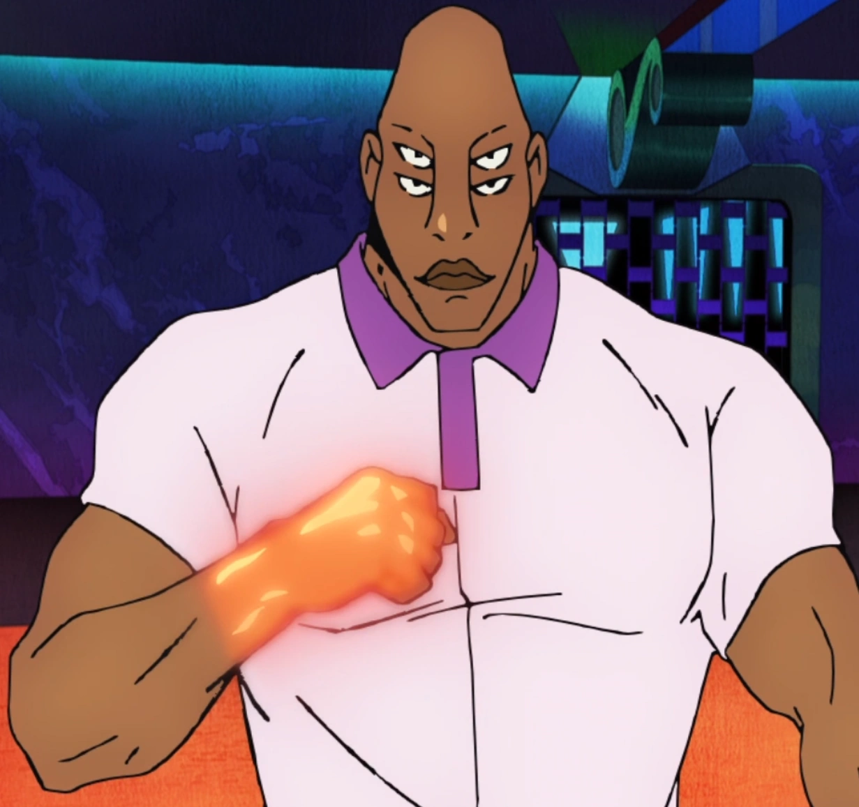 First Emperor was a huge, dark-skinned, four-eyed man with no hair. He wore a white short sleeve shirt with a purple collar.