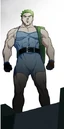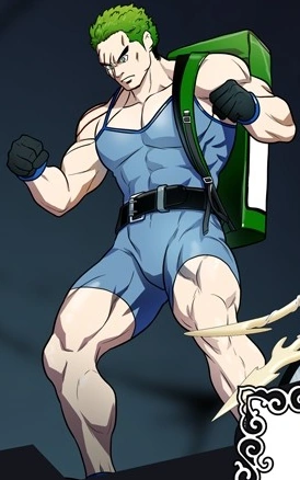 He is a muscular man that has green hair and eyes, with a scar going over his right eye and down his shoulder. He wears a tight-fitting blue sports unitard, with a black belt around his waist and a green backpack hangs over one of his shoulders.